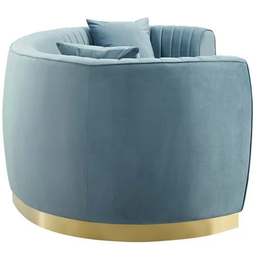 This Enthusiastic curved sofa with two matching accents pillows. The vertical channel tufting and sweeping grace of Enthusiastic gold stainless steel base magnify the unique curved shape of this retro modern sofa that will be the focal point of your living room, lounge room, home office, and other seating areas.
